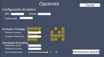 Al ejecutar la escena se genera el puzzle y se pueden acceder a controles para cambiar los parametros de las tecnicas Evolution Strategy y Simulated Annealing, además de poder volver a generar el puzzle.